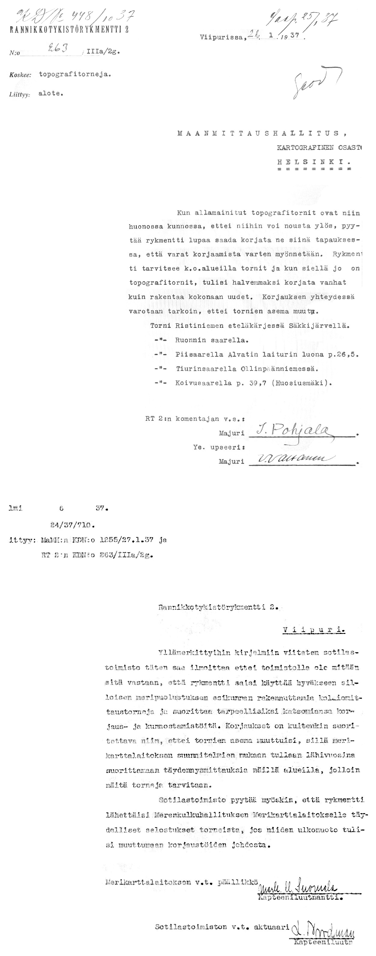 22: 26.1, 6.2.1937 (Kolmiomittaustornit Viipurin ympäristössä)