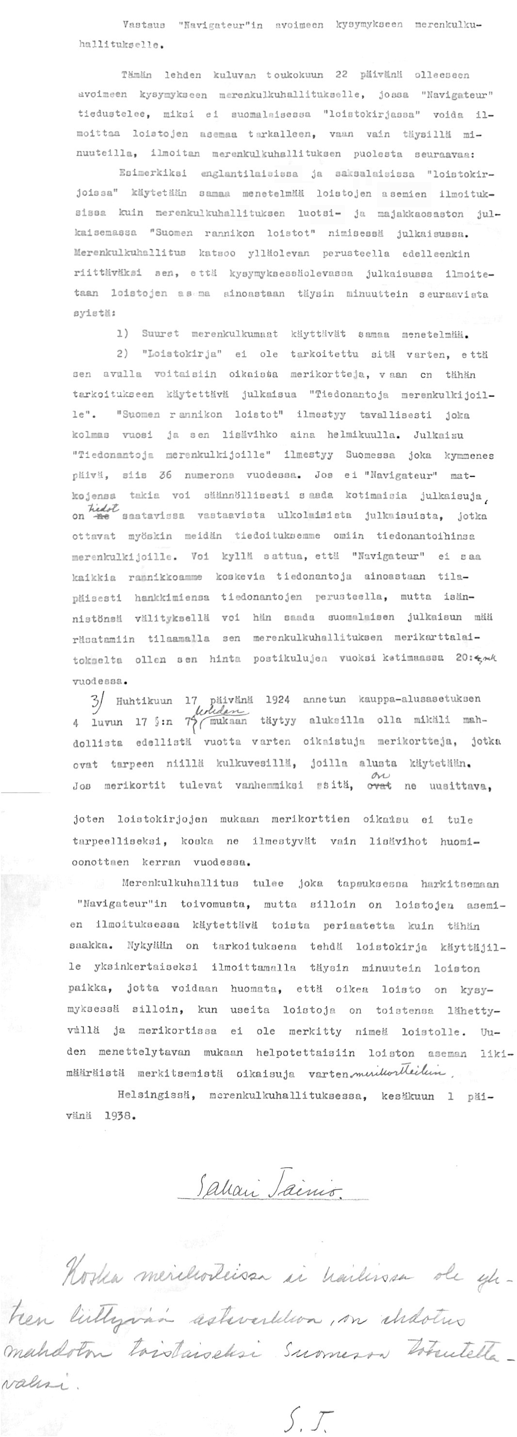 55: 1.6.1938 (Loistojen merkintä merikorteissa ja julkaisuissa)