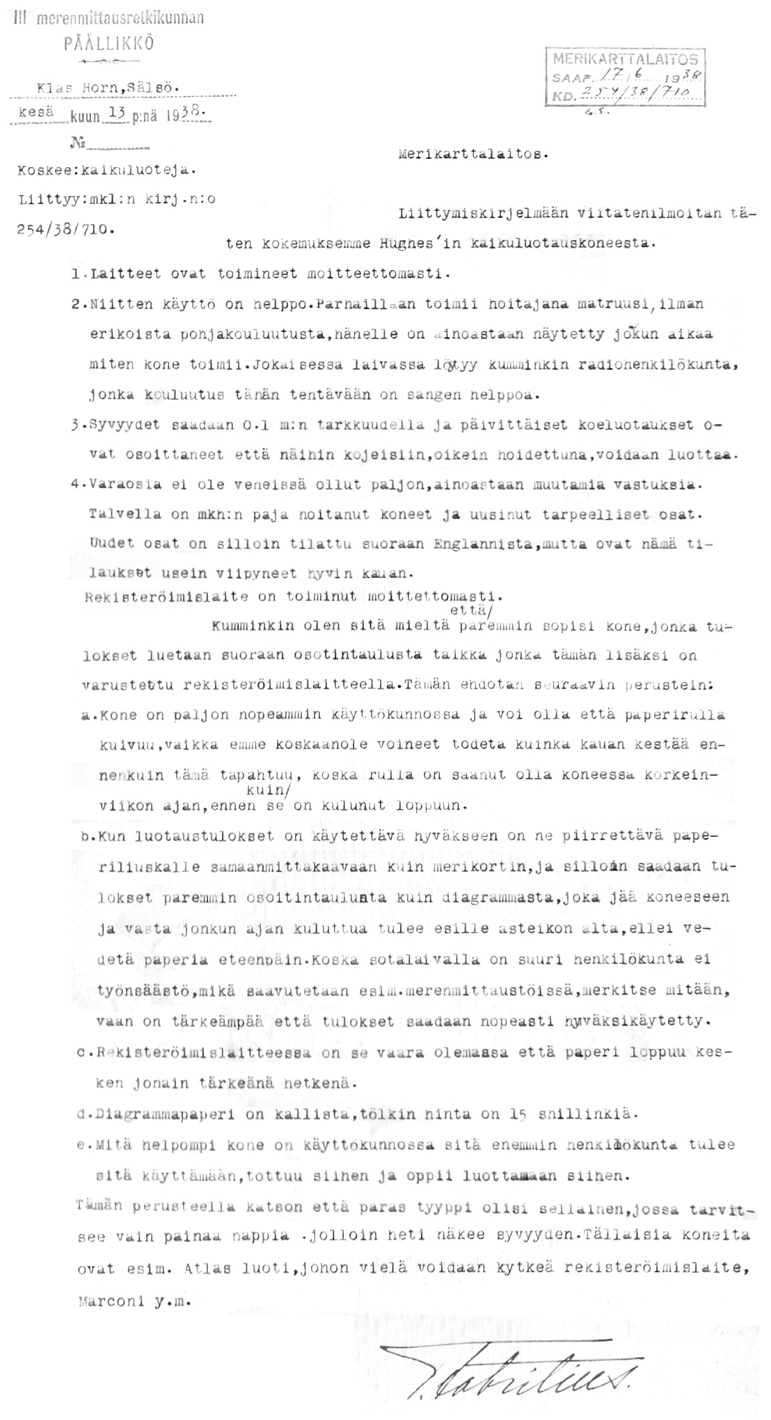 57: 13.6.1938 (Kaikuluotauskoneen hankinta)