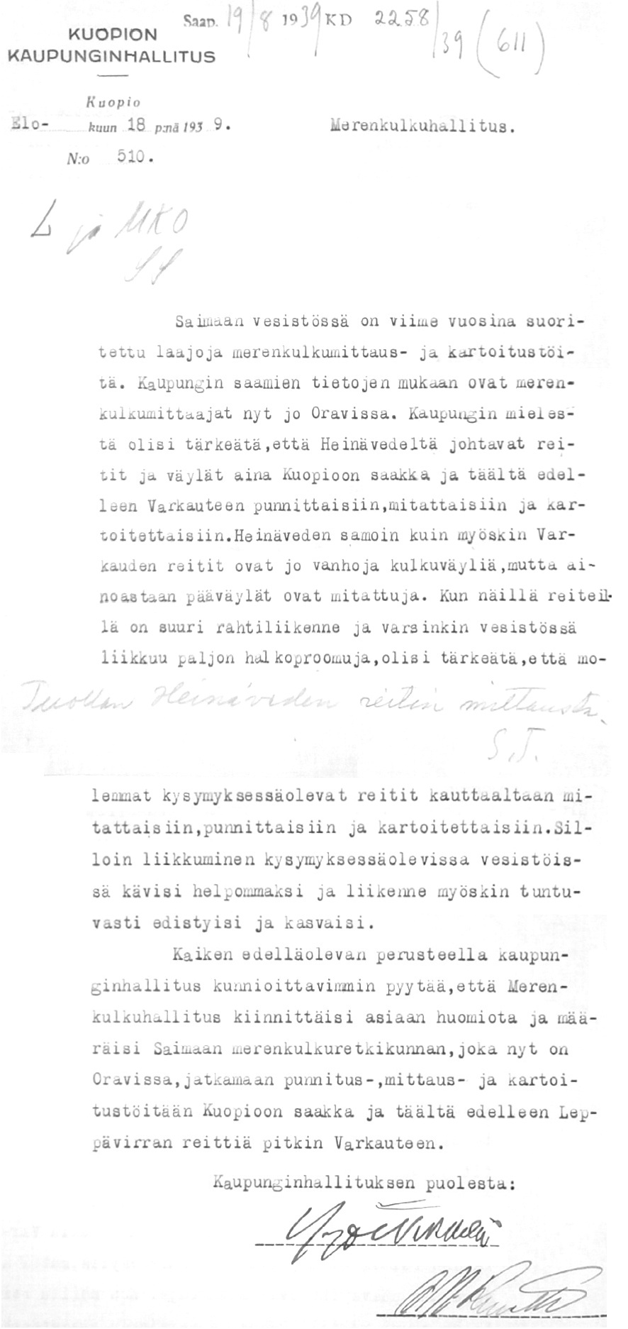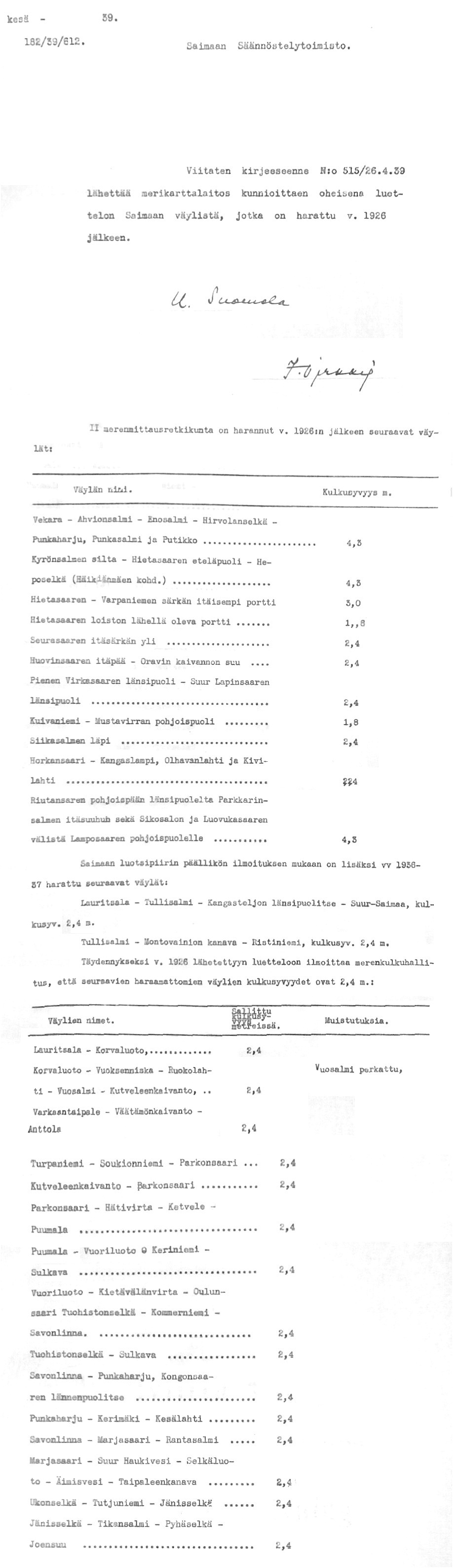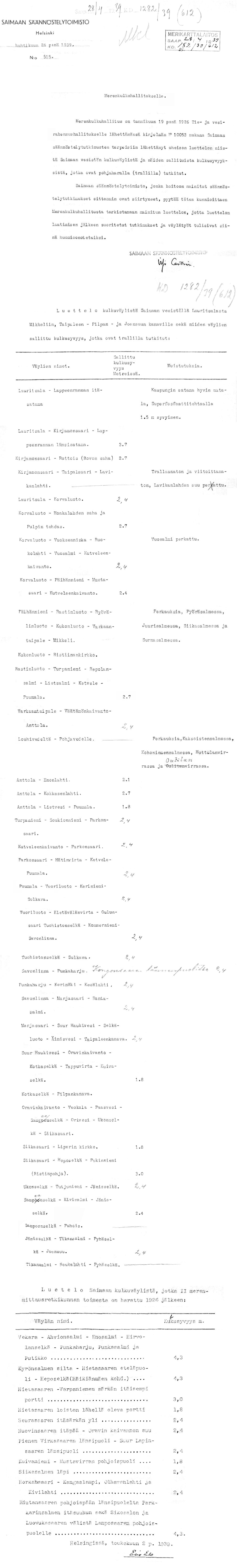 102: 22.9.1939 (Merenmittauksista Saimaan vesistössä)