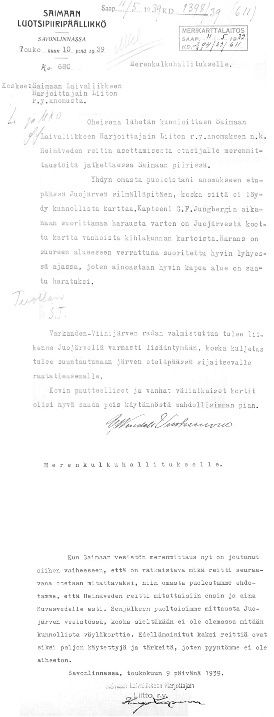87: 9.-10.5.1939 (Merenmittauksista Saimaan vesistössä)